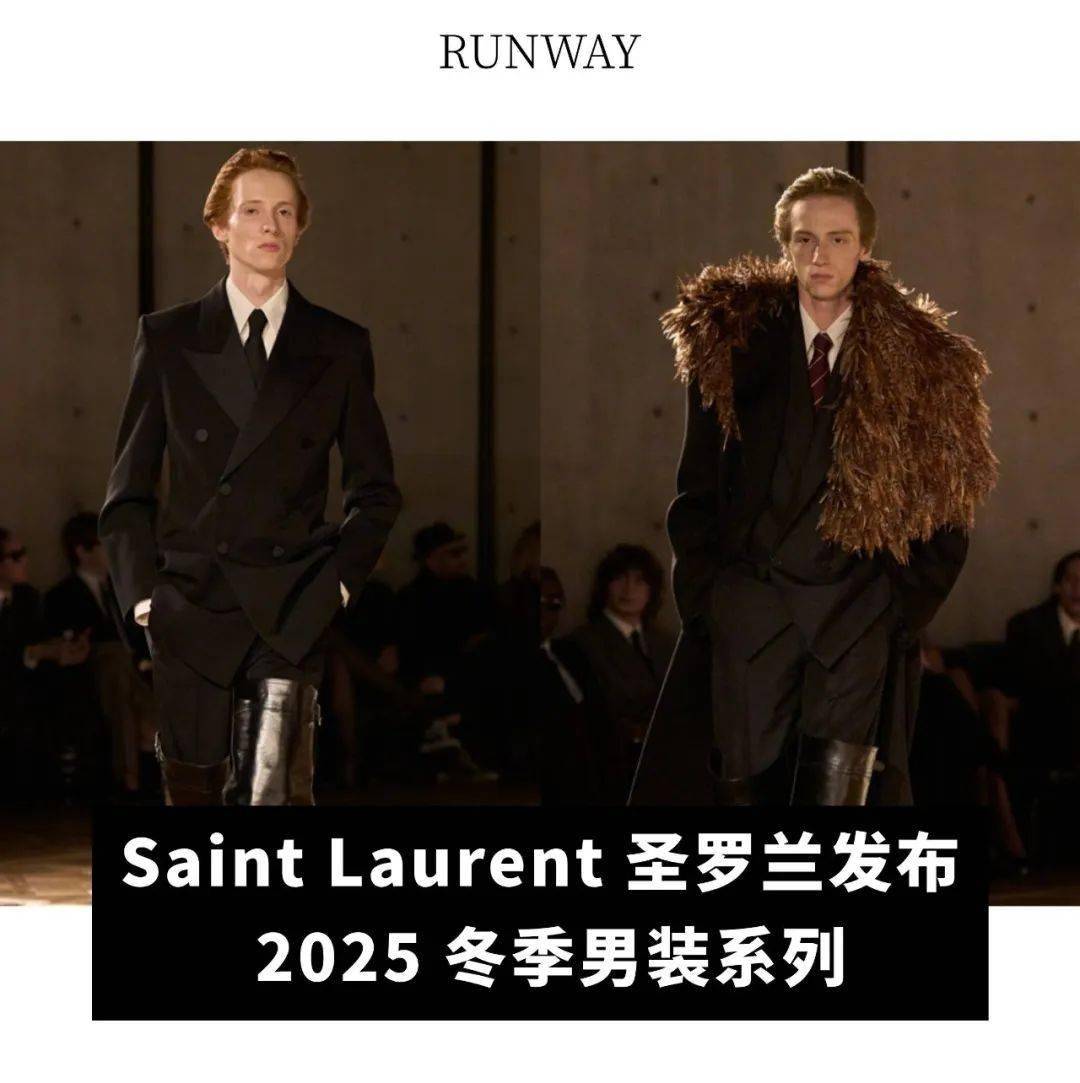 自创立以来,Saint Laurent 圣罗兰品牌中对立气质之间的张力一直是其重要标识。这源自创始人伊夫·圣罗兰先生截然不同的个性:一位是追求新奇体验的唯美主义者,另一位则是稳重的文学才子。在圣罗兰2025冬季男装系列中,创意总监安东尼·瓦卡莱洛(AnthonyVaccarello)强调了这种与生俱来的双重性,展现品牌内核。对比贯穿了本季男装系列,看似矛盾的元素为简洁的剪裁设计注入了出人意料的流动性。该系列灵感源自于伊夫·圣罗兰(Yves Saint Laurent)先生在高定系列或左岸系列的经典衣橱,以及摄影师罗伯特·梅普尔索普(Robert Mapplethorpe)的艺术精神。这种既威严又充满诱惑力的优雅贯穿于整体廓形与单品设计之中。本季中,大胆而新奇的搭配让品牌内核中的性别流动特质焕然一新,譬如宽大的羽毛装饰外套和利落的双排扣夹克大胆搭配高筒靴,展现出截然不同的风格。